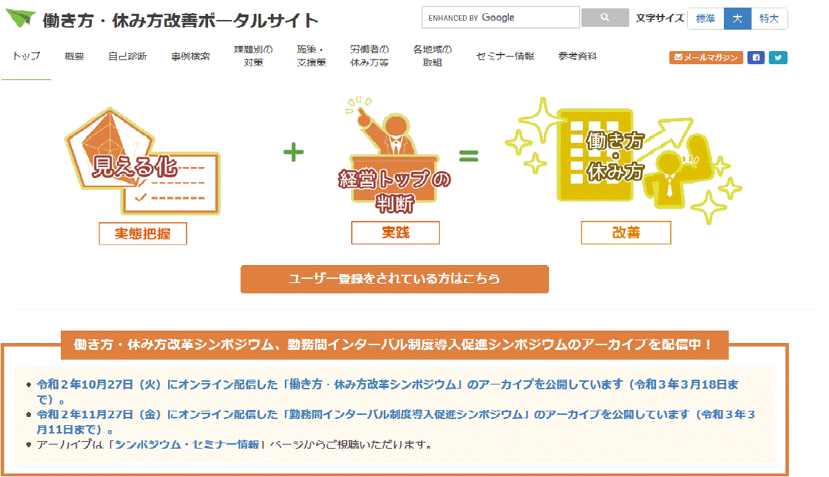 サイト上では働き方改革に取り組んでいる21企業の具体例の紹介や、簡単な操作により「働き方・休み方改善指標」に照らして自社の現状が“見え