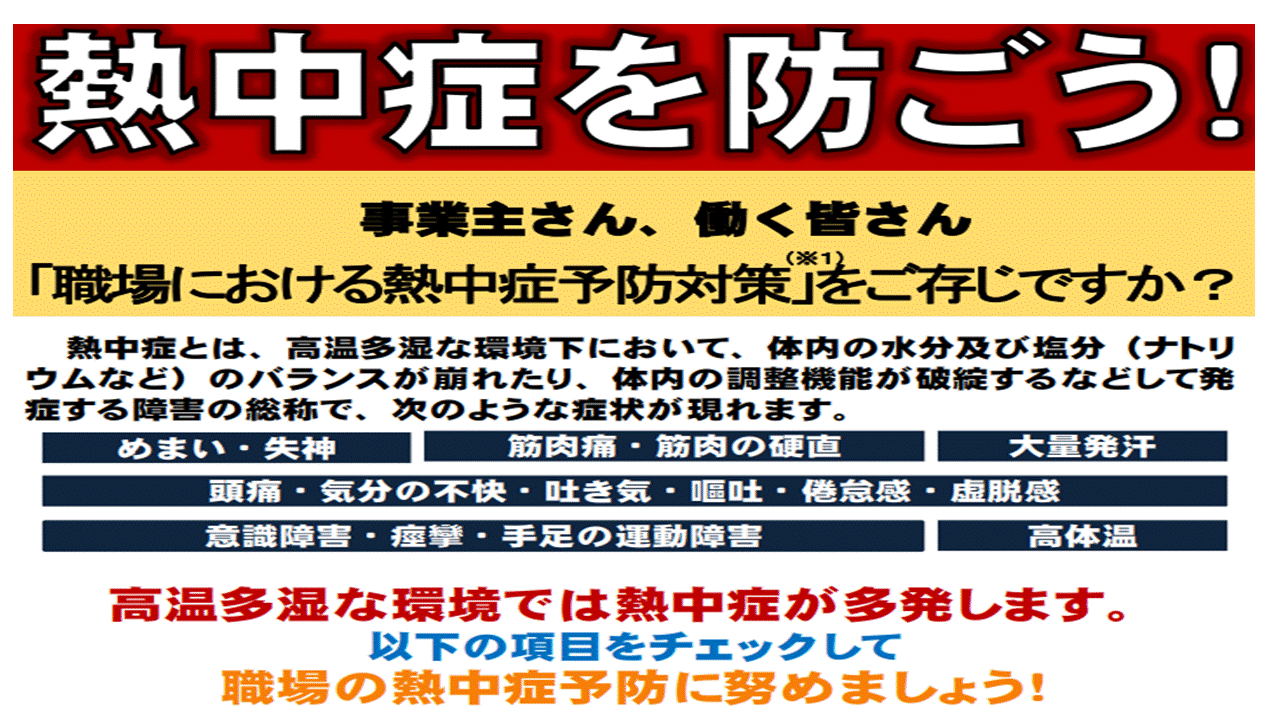 特に作業場所のWBGT値(暑さ指数)を実測して作業に反映させることや、熱がこもりにくい服装にも注意するよう呼びかけるとのこと。