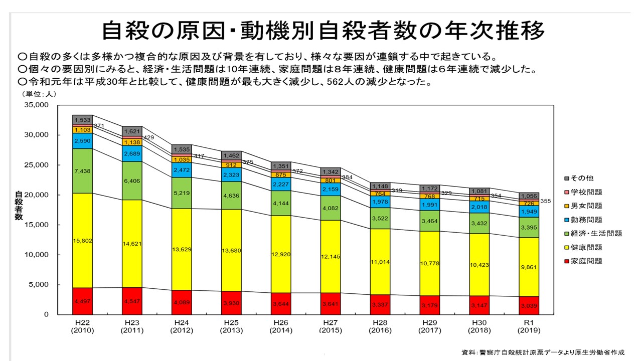 2019年度の自死者数は20,169人と2010年以降、10年連続の減少継続中かつ、1978年からの自死統計上過去最低となりました。