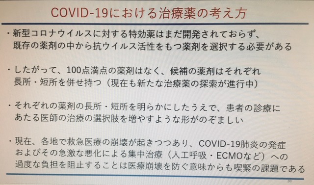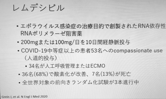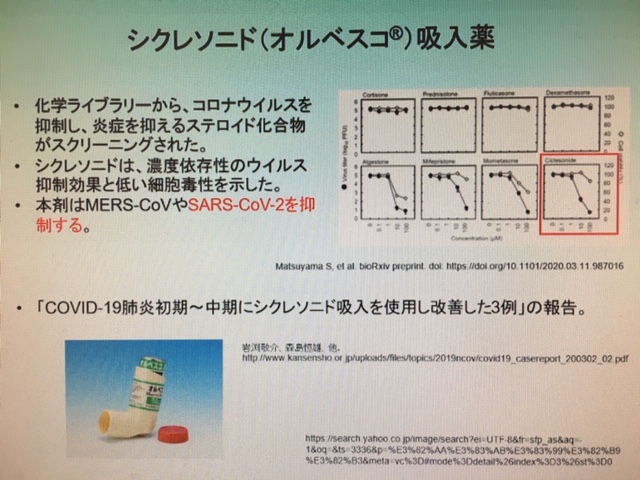 ・抗ウイルス作用と抗炎症作用の双方を持ち、長らく喘息の治療薬として市中でなじんできている製薬。死亡率は2%程度と低値。