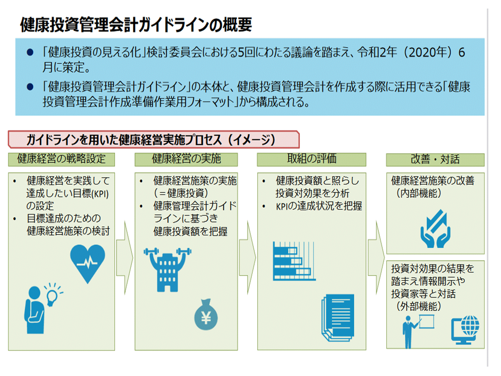 出典:経済産業省.「健康投資管理会計ガイドライン」を策定しました-健康経営の効果的な実施や、様々な市場との対話のための枠組み-(2020年6月12日)