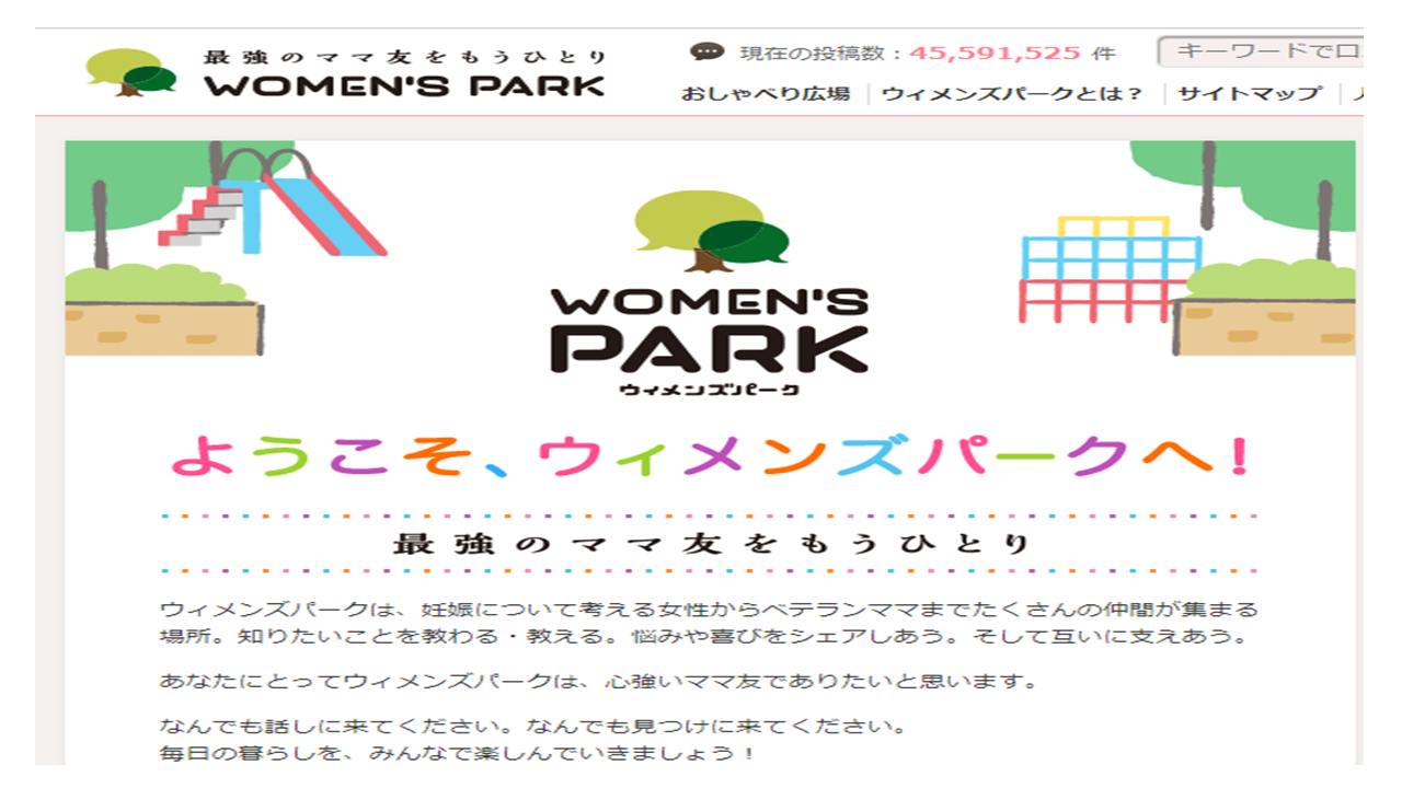 「最強のママ友をもう一人」というキャッチコピーが物語るように、「ウィメンズパーク」は、子を持つあらゆる世代・状況の母親を対象とした、ピア・カウンセリング、ピア・コンサルティング機能を持たせた無料相談サイトです。運営はベネッセです。