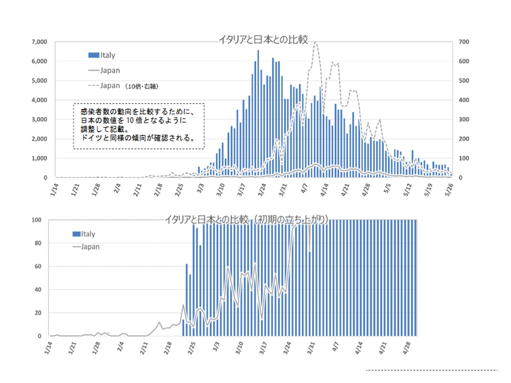 【図 2.東京都における感染者数の推移(左図:確定日、右図:発症日)】にあるように非常事態宣言が出された4月7日は、すでに感染者数のピークは過ぎていました(つまり、感染抑止にはならず、経済を混乱させ過剰死を招いてしまった)。