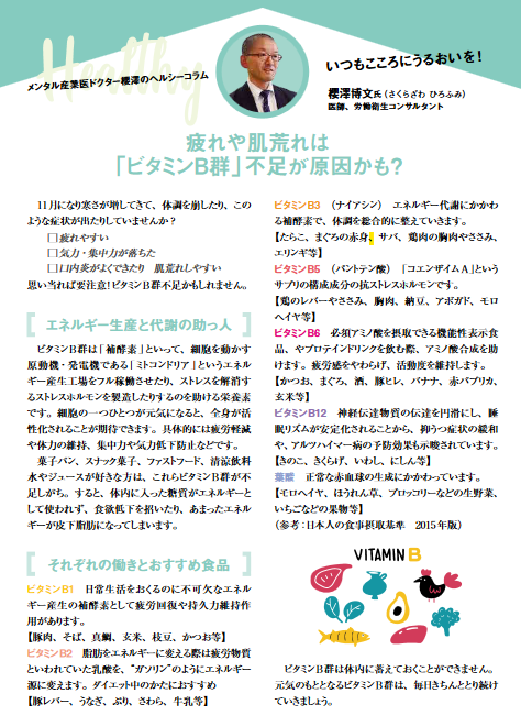 『メンタル産業医 ドクター櫻澤のヘルシーコラム いつもこころにうるおいを! 疲れや肌荒れは「ビタミンB群」不足が原因かも?」が、以下に掲載されました。
