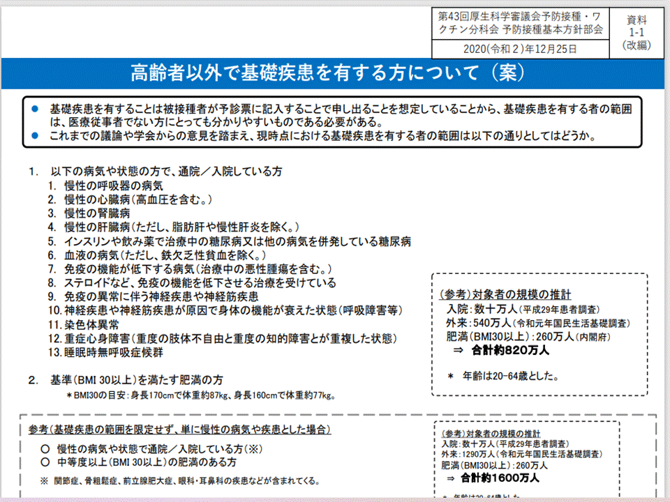 以下のように「基礎疾患」という、いわばコロナワクチンの優先接種対象者が、