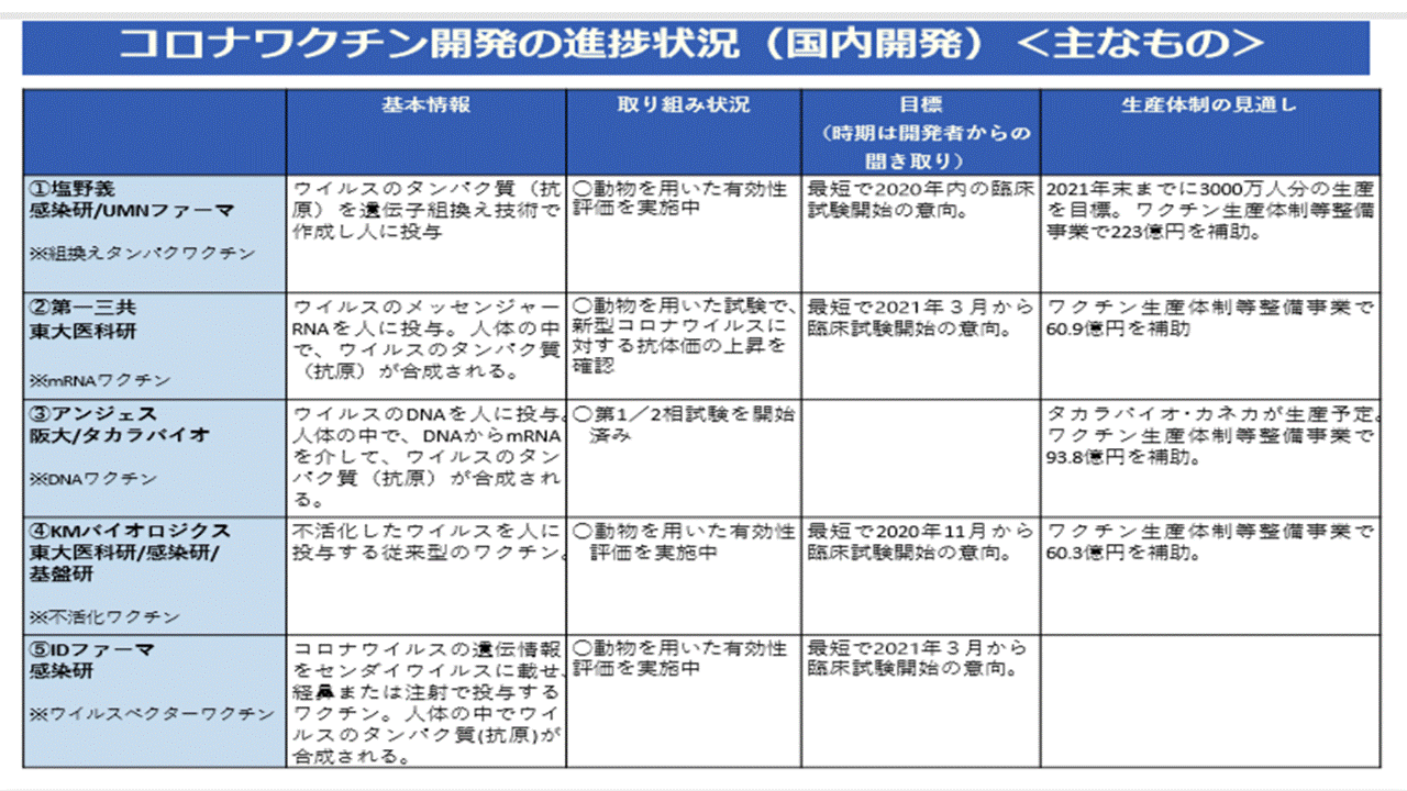 参考サイト:日経新聞電子版2021年2月20日.武田や第一三共、コロナワクチン治験へ 国内生産準備
