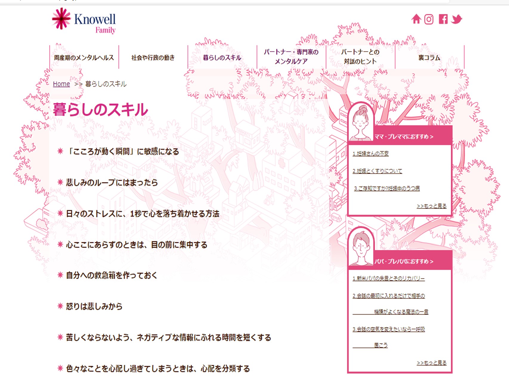 「Knowell Family」とは、国立精神・神経医療研究センターの運営メンバーが中心となって認知行動療法をご紹介するサイトです。主に周産期を対象としているとのことですが、性差を問わず誰しも子であった時代があることから、全ての世代においても、どれだけ親は、自身に愛情や保護、安全を提供していたのか、親の恩顧を感じながら、そもそもの認知行動療法を元に、ストレス因子を上手に制御できる具体的な知恵や技術が学べる内容です。