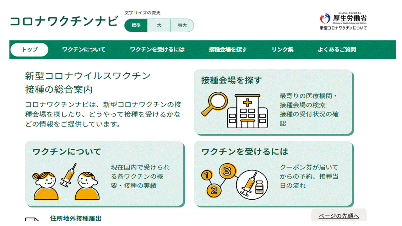 コロナワクチンの接種会場を探すサイトは「コロナワクチンナビ」として用意されています。