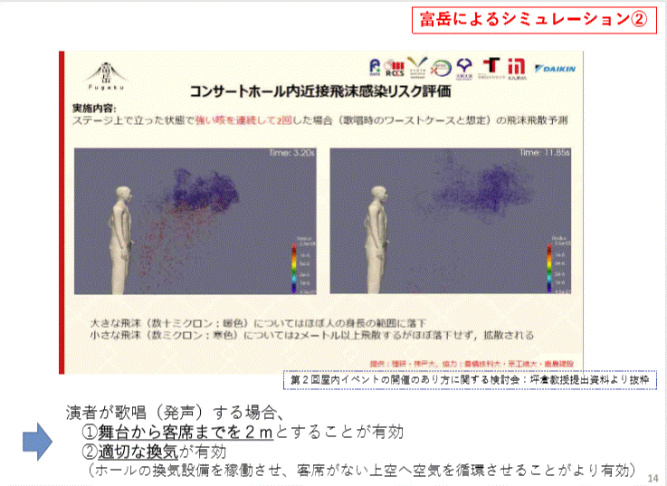 職業声楽家、歌手が感染していたとしても、演奏家や伴奏者、観客に感染を拡大させないために、最低、2メートルは隔離する必要があること、富岳によるシミュレーションによって導き出されました。