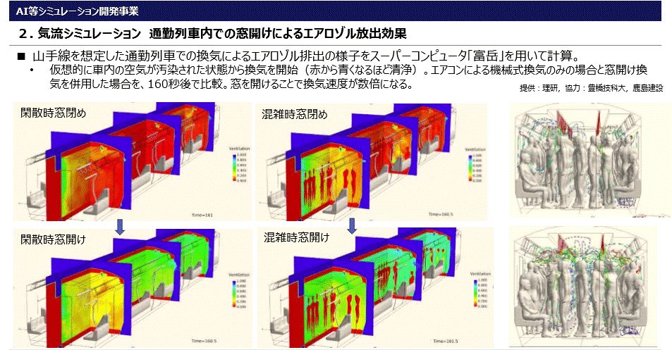 富岳を使っての感染シミュレーションを行った結果、どの程度の窓開けを行ったらよいのか検討され、検証結果を踏まえて、電車の窓の開閉幅等の指示がされました。