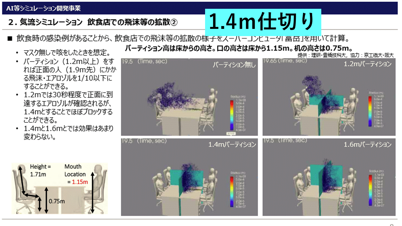 オーストラリアは、離れ小島に隔離しました。日本では座っての仕事や食事をする際、床から数えて1.4mになる仕切りを用意することで、この封じ込めが可能であること、以下のように富岳を使ったシミュレーションが有効性を証明しています。