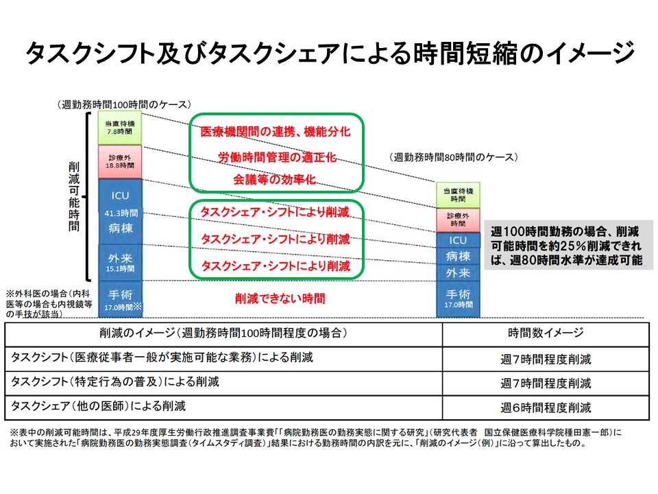 川崎医師自身が整形外科医を志した25年前の実情を踏まえ、厚生労働省、日本医師会および医療機関による週20時間分のタスクシフトという、医師業務分担の実例紹介、産業医科大学での実際の働き方改革、同整形外科学講座でのITを活用した会議の削減例他、明日からすぐ導入できる対応事例が複数紹介されました。