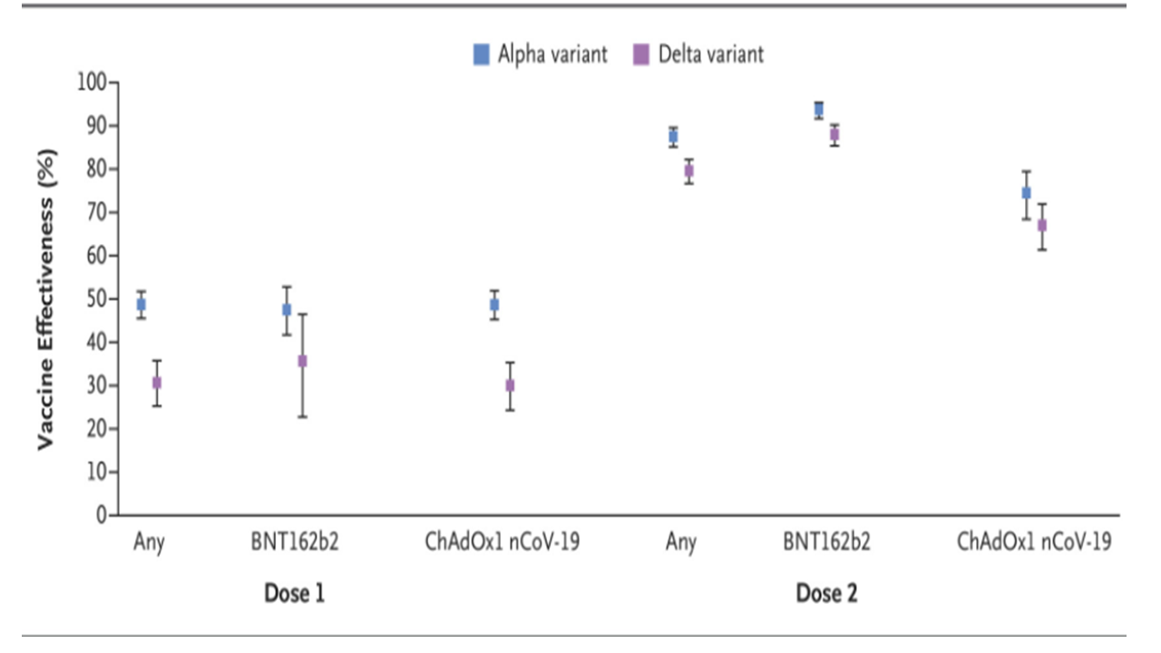 AstraZeneca-Oxford製ワクチンでは、アルファ株では74.5%、デルタ株で67.0%へと低下していた。