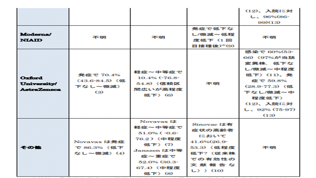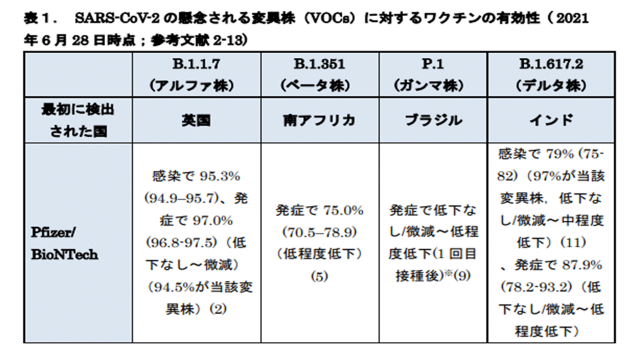 これらの変異株に対するワクチンの有効性に関して、2021年6月30日までに「公表されていた」研究報告の国立感染症研究所まとめは以下です。