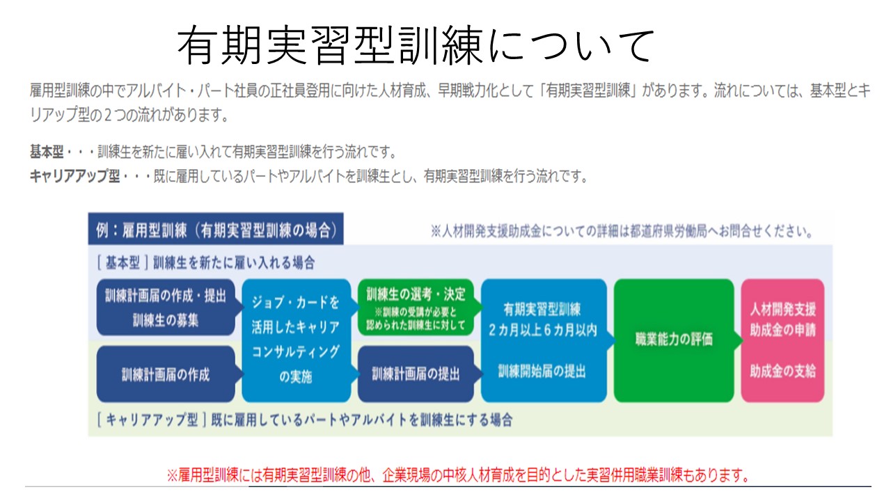 ◎雇用型訓練とは、ジョブ・カードを元に、正社員登用に向けた支援制度で、「人財開発支援助成金」の支給対象となっています。