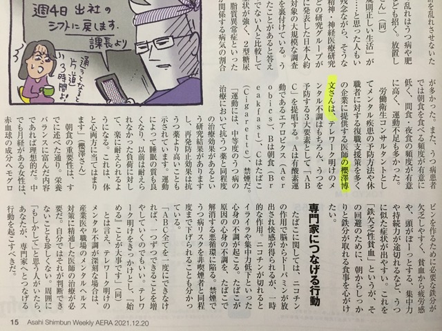『「メンタル産業医」入門』(日本医事新報社)でも取り上げたうつ予防のABCや、鉄欠乏性貧血に伴う抑うつ症状を改善するための栄養素の重要性について記載したあざみ野STYLEで記載した内容も取り上げてくださいました。