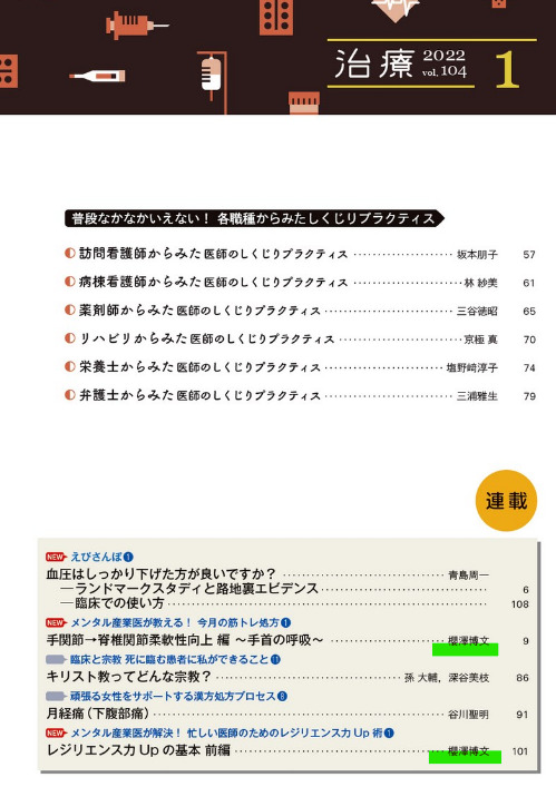 「治療」は、南山堂より総合診療を楽しむためにちょっとがんばりたい医師を読者対象としています。その2022年1月号は編集幹事として独立行政法人国立病院機構 栃木医療センター 内科の矢吹 拓先生をお迎えされての「よくあるしくじりプラクティスTop3 ジェネラリスト必見!知って得するみなさんの本音」という特集が組まれており、定価:2,750円(本体2,500円+税10%)で2022年1月1日発売です。