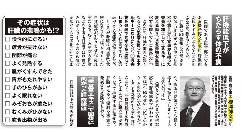合同会社パラゴン(東京都港区)代表でメンタル産業医の命名者として知られる櫻澤博文監修記事が「週刊女性」2022年1月1日号 第71回今日から役立つ「ライフアップレポート」「「疲れが抜けない」「だるい」「肌がくすむ」あなたの肝臓 は大丈夫?!」に掲載されましたので報告します。