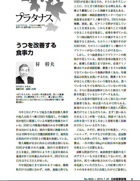 ・同年5月 昇幹夫ら. うつを改善する食事術. 春陽堂 にてパン食を中心とした洋食が石油製造物であることと、抗うつ薬服薬による相乗効果で自死が増加することを啓発。