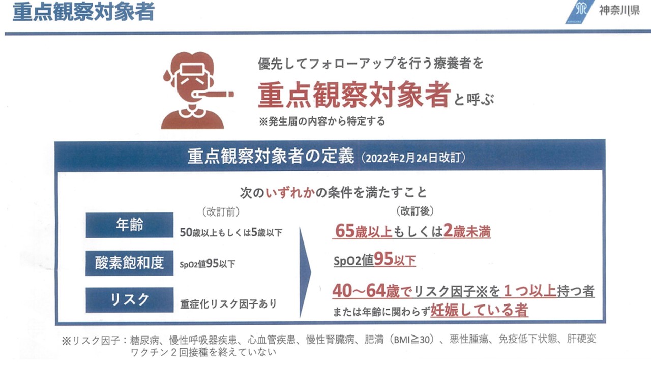 神奈川県が2022年2月24日に「重点観察対象者」という、いわば入院基準でしょうか。その定義を改訂しました。