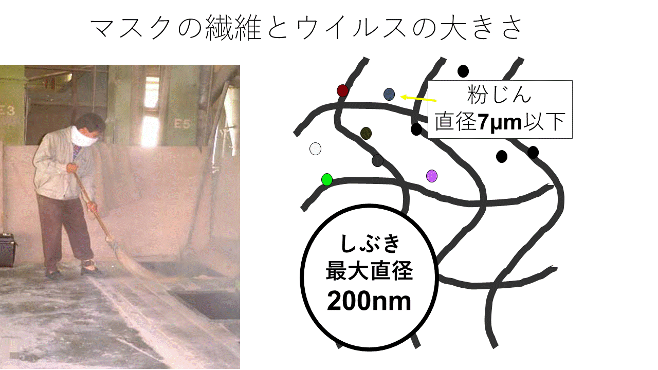 仮にマスクに効果があり、感染源である唾液の塗抹、飛沫、しぶきを吸収しえたとしても、呼吸を繰り返していたらうち乾燥したウイルスが悲惨な飛散を行うことは想像に難くありません。そもそもマスクの目の粗さとウイルスの大きさは、野球場対野球ボールの比だからです。