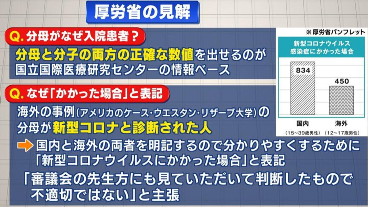 『国内と海外の事例が並べて表記してありますが、海外の事例の分母が「新型コロナと診断された人」で入院患者ではないことから国内と海外の両者を明記するので、分かりやすくするために「新型コロナウイルス感染症にかかった場合」と表記した。審議会の先生方にも見ていただいて判断したもので不適切ではない』と
