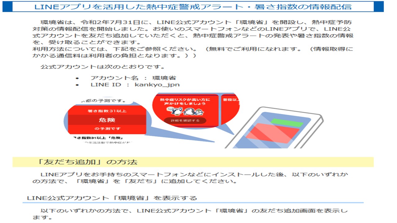 対して環境省は 熱中症の危険情報を LINEによる友達申請機能を使って発信することで 「声かけ運動」を補完しています。