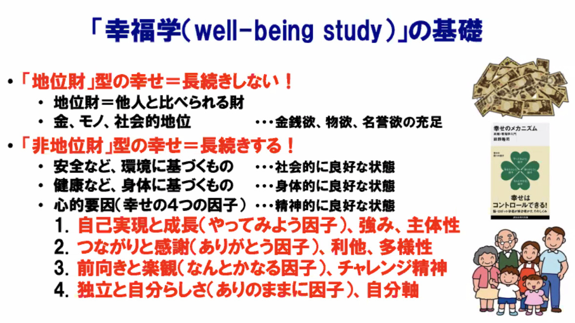 幸福度向上に向けては、非地位財の確保や獲得を求めると良い。地位財には限りがあるのみならず、増加しても必ずとも幸福度向上とは比し得ないことが判明している。