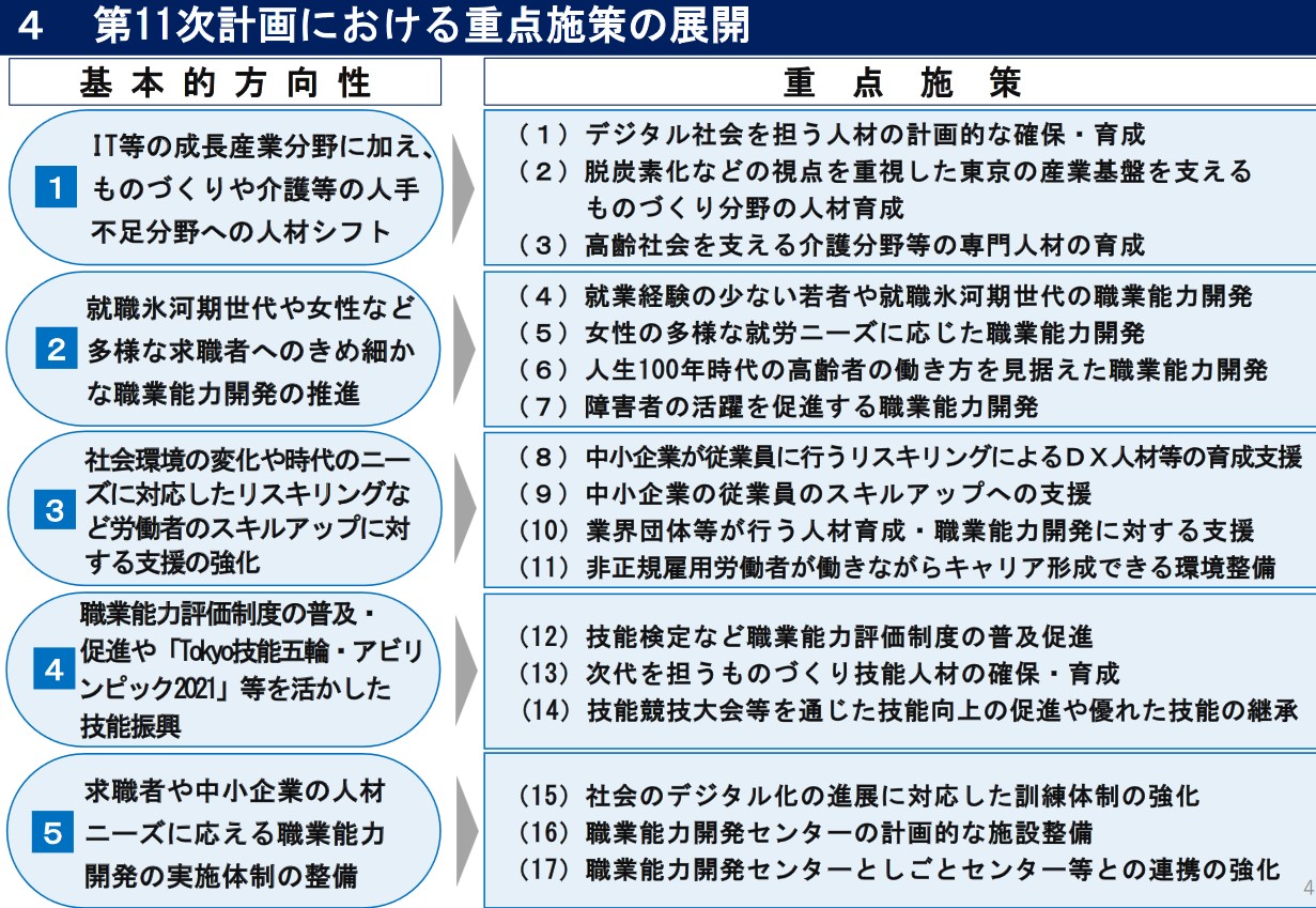 例えば、東京都の場合、第11次東京都職業能力開発計画を策定し、以下の5つの基本的方向性に基づき、17の重点施策を推進するとのこと。