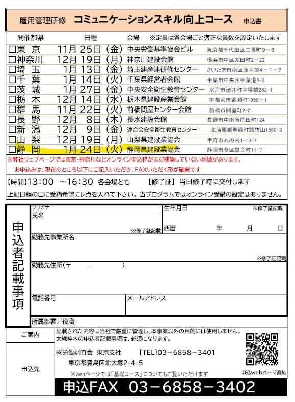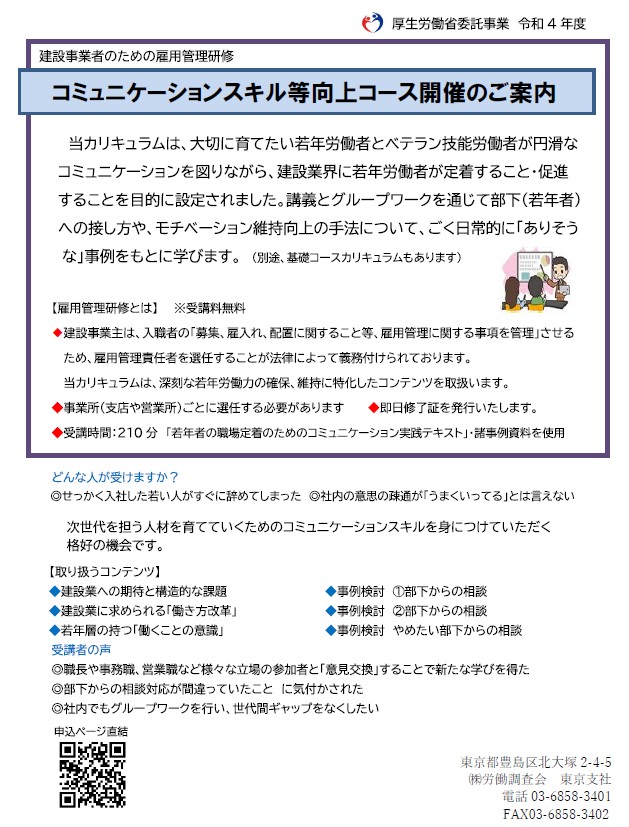 この厚生労働省委託事業建設事業者のための雇用管理研修コミュニケーションスキル等向上コース案内のチラシはこちらからダウンロードできるようにしております。