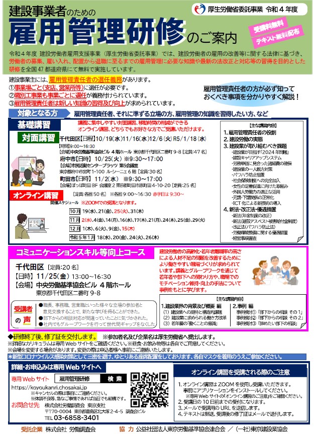 もともと 「建設労働者雇用支援事業」(厚生労働省職業安定局委託事業)では、“建設労働者の雇用の改善等に関する法律(以下、建設労働者雇用改善法)”に基づいてこれら講習及び相談・援助業務を無料で行っているとか。
