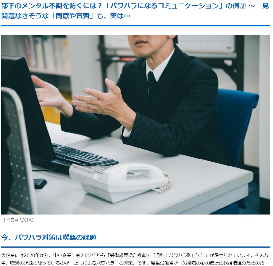 「労働施策総合推進法」(通称:「パワハラ防止法」)に準じた支援が必要とされる中、メンタル産業医命名者で健幸経営の推進者でもある合同会社パラゴン(東京都港区)代表 櫻澤博文による「イシャチョク」((株)オンラインドクター.com運営)での記載が好評なため、2022年10月7日発信の以下のように連続掲載されました。