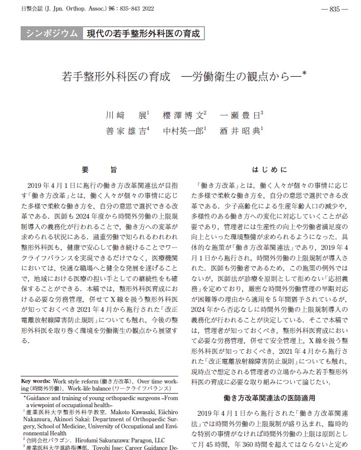日本整形外科学会雑誌96巻835~843に、「若手整形外科医の育成ー労働衛生の観点からー」が掲載されました。