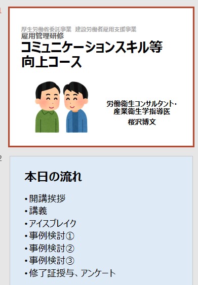 厚生労働省委託 建設労働者雇用支援事業 雇用管理研修コミュニケーションスキル向上コース が2022年11月25日13時から、東京都北区の北とぴあ14階カナリアホール で開催されました。その講師をメンタル産業医で知られる合同会社パラゴン(東京都港区)代表の桜沢博文が務めたので報告します。