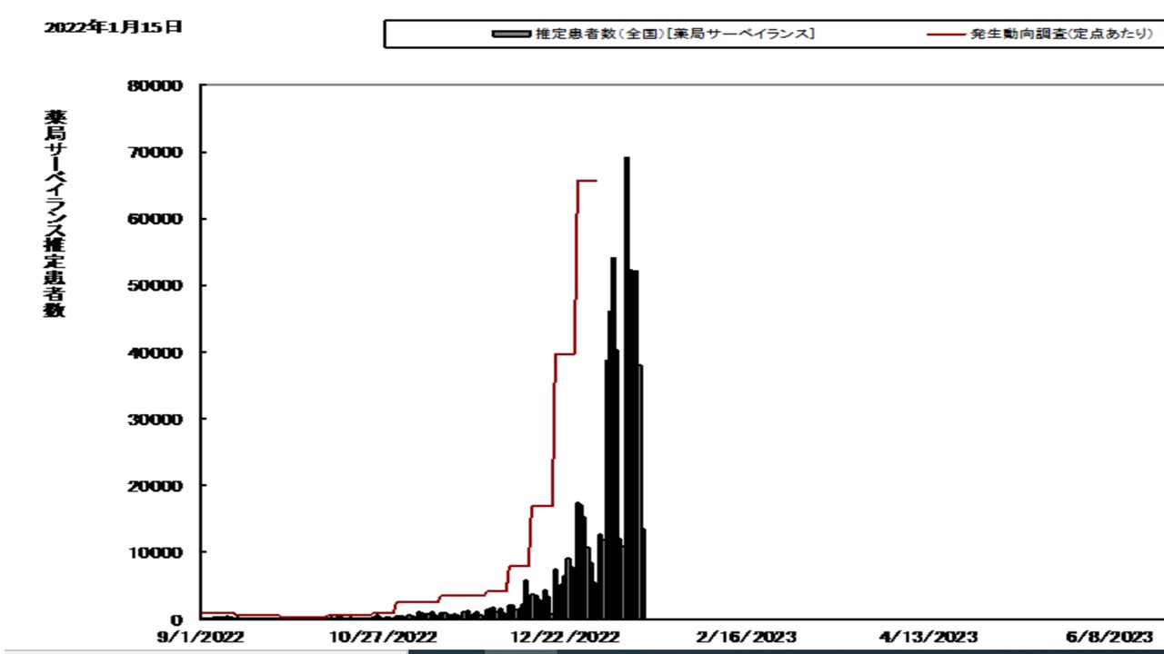 1月17日 1日の推定罹患者数が5万715人。この数値は2022年12月内は一日当たり5千人程度だったことからすると、10倍には増えました。