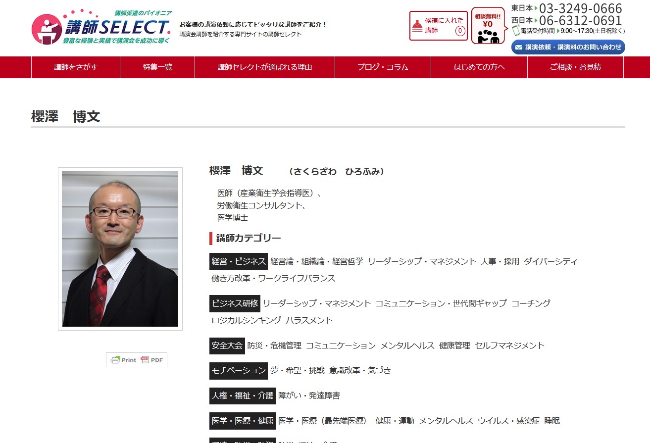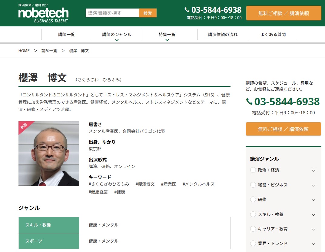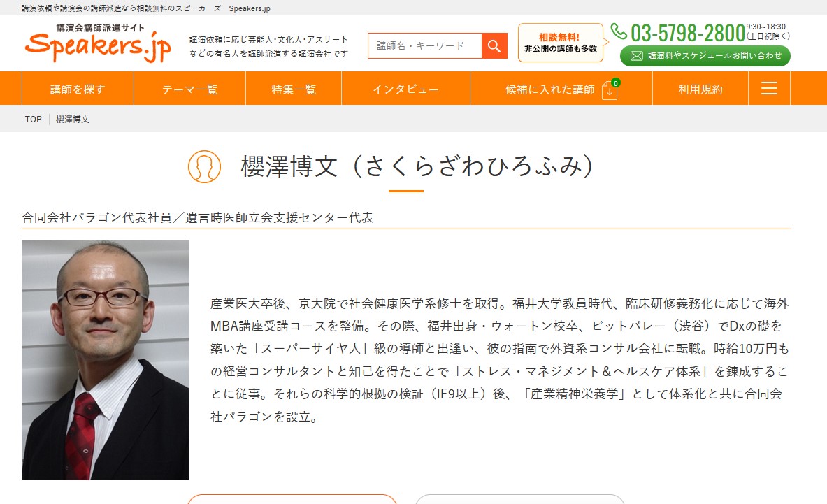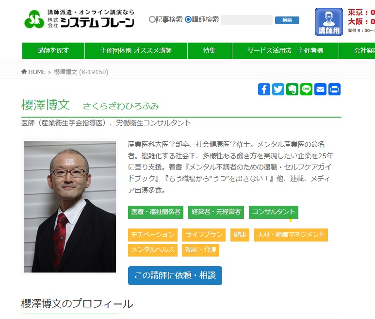 人的資産投資を踏まえた健幸経営(ウェルビーイング経営)に関し、健康経営優良法人(「ホワイト500」のみ)認定やISO30414認証を筆頭に、多くの企業支援を行うのみならず、多数の講演実績を誇るメンタル産業医の命名者こと、櫻澤博文の講演会への講演依頼や講師派遣に長けた各社が講演依頼に対して講師派遣や講師紹介を行ってくださっています。
