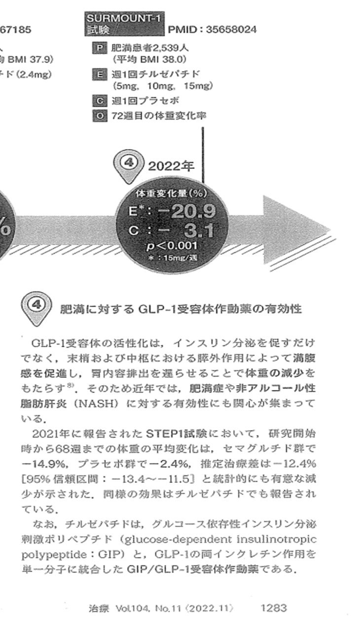 実際に肥満者に「チルゼパチド」を週に一度15ミリグラム投与したところ、偽薬投与群と比較して72週目ですから1年半の経過後では、統計学的に有意差がある2割もの体重減しえていたとの検討結果が示されていました。
