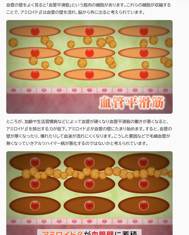 従来、アルツハイマー病罹患者の脳切片を顕鏡視すると、アミロイドβ(ベータ)の沈着が明白でした。従ってアミロイドベータの沈着や蓄積がアルツハイマー型認知症の原因物質とみなされるという、つまりは神経病理学的検討が行われる歴史が 井原康夫の主張以降続いていました。しかしながら最近の研究では、そもそもアミロイドベータとは、酸化されたタンパク質の一種であって、酸化させる喫煙(鉛やヒ素摂取も可能)、運動不足や過剰摂取(糖化)、前述重金属や加工食品に含有される食品添加物等の化学物質によって体内のタンパク質が錆びた結果、沈殿を起こしたにすぎず、それを抗体医薬品で除去しようとも、果たして有効なのか疑問の余地が残るものと理解しえます。言い換えるとこの アミロイドベータ の 沈着は、血管壁を構成する平滑筋の柔軟性低下の説明指標の1つであって、血管平滑筋の硬化によって、有用な生理活性物質(ホルモン、インターフェロン、インターロイキン、イオン等々)の流通途絶が原因だということが推定されてきました。つまりは血管の柔軟性低下・・・動脈硬化や動脈劣化という血管の欠陥化が、中でも平滑筋の弾性低下がアルツハイマー型認知症を筆頭とした認知症の主たる原因だということがわかってきました。