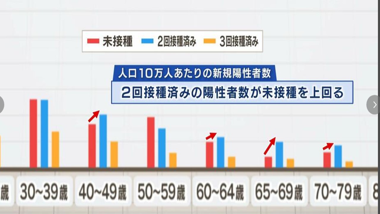 例えば2022年5月11日に厚労省によって招集開催された「第83回新型コロナウイルス感染症対策アドバイザリーボード」資料によると、4月11~17日に40~49歳、60~64歳、65~69歳、70~79歳の各世代で、ワクチンを2回接種した人10万人当たりの新規陽性者数が、未接種の人10万人当たりの新規陽性者数を上回っていました。
