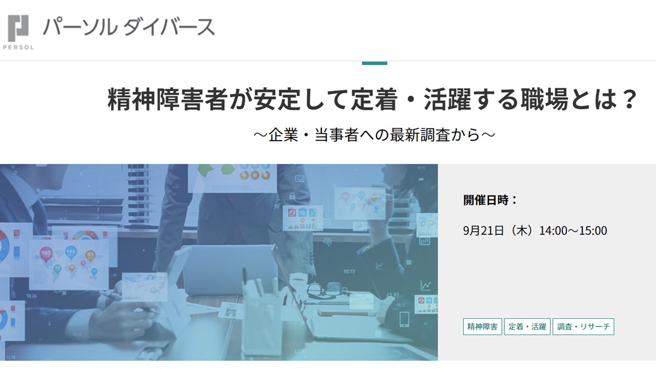精神障害者が安定して定着・活躍する職場とは?~企業・当事者への最新調査から~ という題でのオンラインセミナーが以下の共催で開催されます。