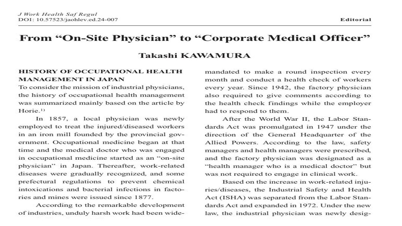 長らく京都大学の産業医を務められてきた川村孝先生のご高見が産業保健法学会の英文誌のeditorialに掲載されました。