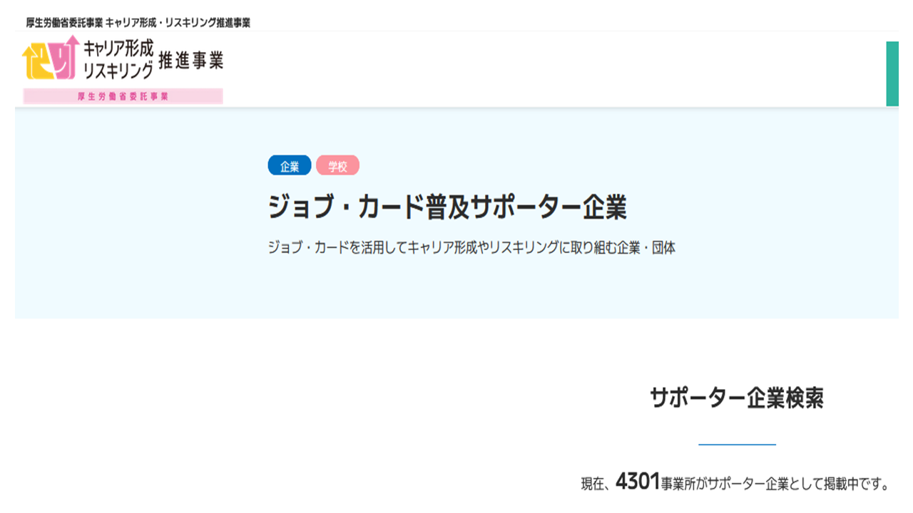 そのキャリア形成・リスキリングセンターが、ジョブカード普及サポーター企業を紹介しています。
