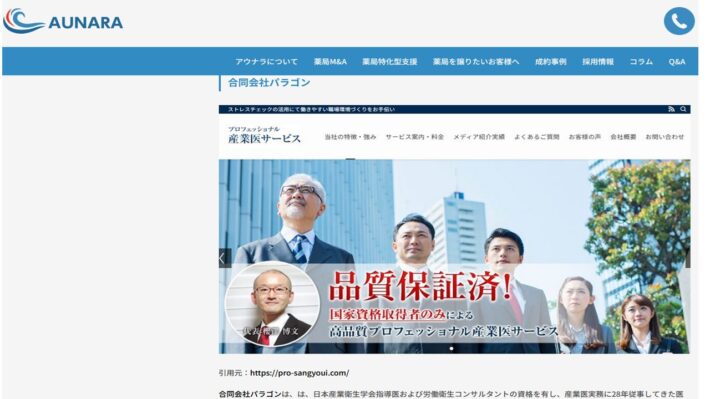 調剤薬局特化型M&A仲介会社 株式会社アウナラという、調剤薬局の存続支援、雇用促進、地域医療サービスの向上を目的に、薬歴システムの提案や多様なM&A手法を用いて、質の高いサービスを提供し、全国の薬局に対する豊富な知識とネットワークを活かし、薬局運営のサポートでもあるコラム内の記事「医療現場の課題を解決するおすすめ企業とは?注目の医療関連サービスを紹介」に合同会社パラゴンが「名義貸し(名ばかり)産業医」とは一線を画し、企業の課題に深く関与しながら労務・健康管理の改善策まで助言する点が特長と掲載されました。