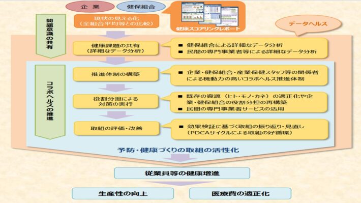 また、以下の概念図を実務に落とし込む 「健康スコアリング活用ガイドライン」 に沿い、健康診断後の事後措置、ストレスチェック集団分析、更には職業性ストレスチェック実施センターによる「働きやすい職場づくり(職場環境改善コンサルティング)」を活用した職場環境改善といった生活習慣支援を一貫して丁寧に実装。現場に根差した継続支援を丹念に積み重ねていただきました。