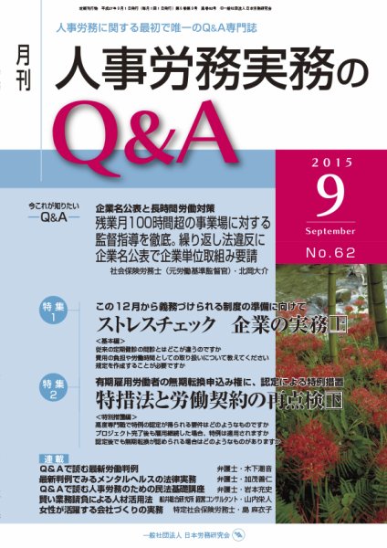 月刊「人事労務実務のQ&A」9月号では「特集1.ストレスチェック 企業の実務(上)」という題にて。同誌11月号では「特集2 ストレスチェック 企業の実務(下)」という題にて当社代表社員さくらざわ博文による回答が22ページから4ページ掲載されております。2015年12月からのストレスチェック制度開始の直前、事業者はどのような準備をしたら良いのか、3回にわたっての連載企画の完結編です。3回中医師としては代表社員だけが、しかも2回も執筆を任せられています。全国の産業医の先生にとっても有益かと存じますのでご一読賜れたら幸いです。