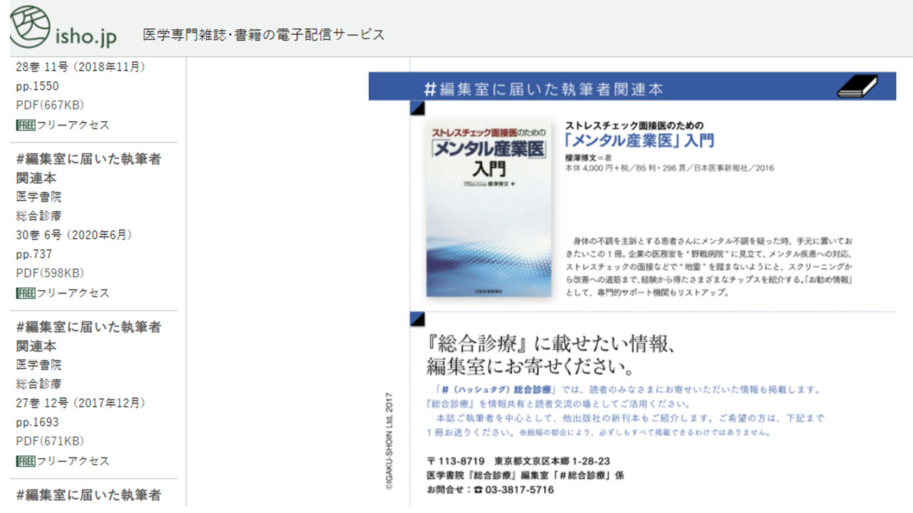 日本医事新報社から刊行されている、メンタル産業医の命名者である合同会社パラゴン(東京都港区)創設者 櫻澤博文 執筆の『ストレスチェック面接医のための「メンタル産業医」入門』(いわゆる「メンタル産業医入門」)を、医学書院刊「総合診療」2017年9月15日号が以下のように取り上げてくださいました。