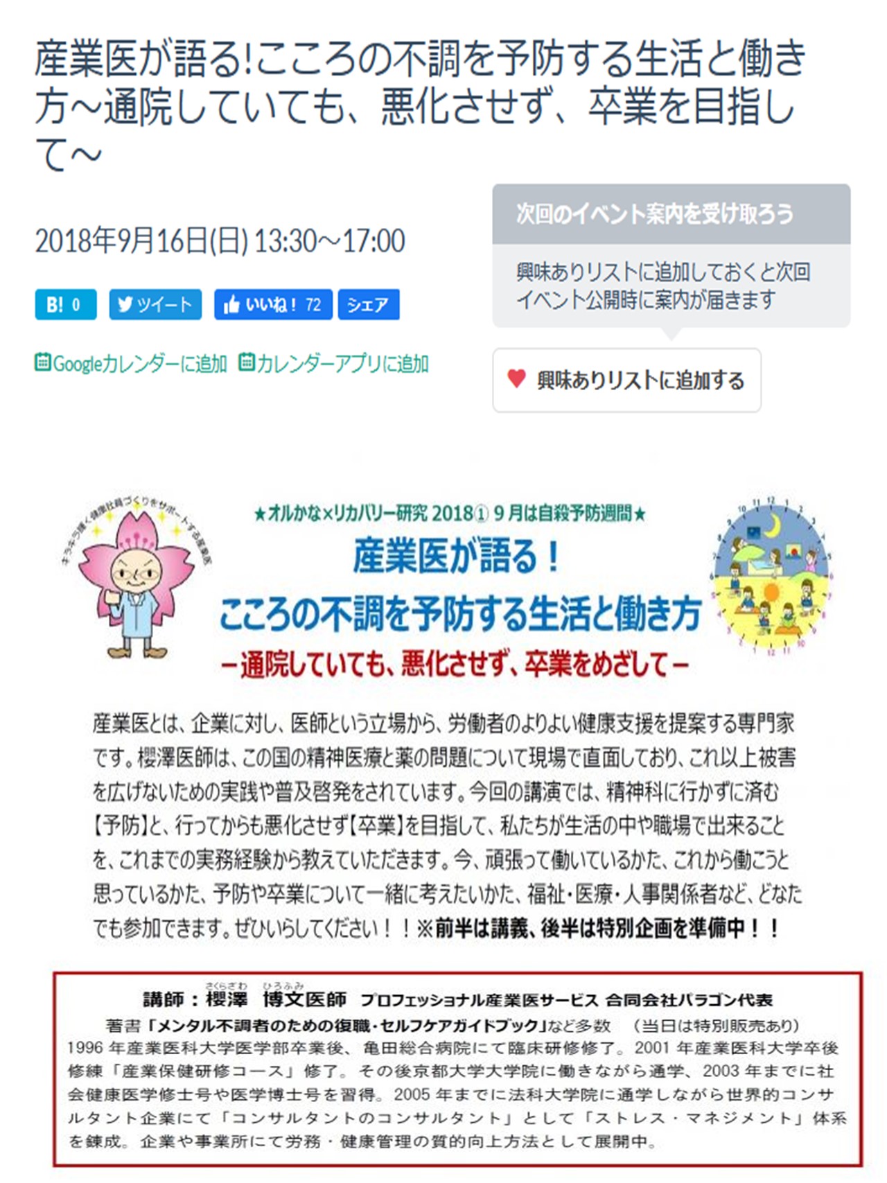 ■自殺予防週間最終日の9月16日に、講演会「産業医が語るこころの不調を予防する生活と働き方~通院していても、悪化させず、卒業を目指して~」に登壇し、自殺の背景にあるメンタルヘルス不調に「ならない」「させない」「こじらせない」支援を提供しました。