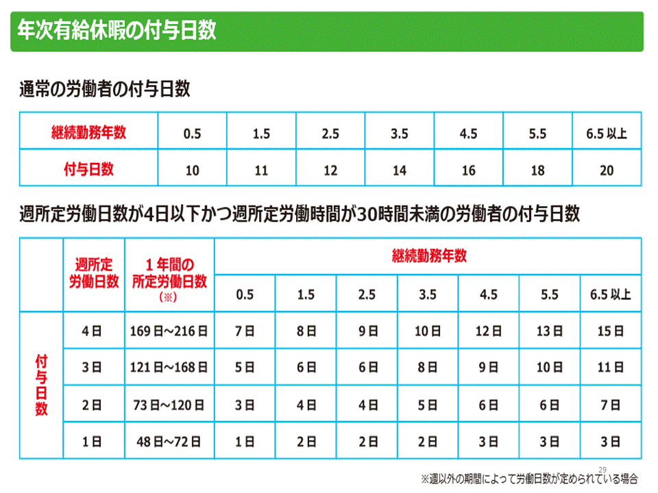 元々労働基準法によって、採用日から数えて6か月間労働契約が継続し、その間の全労働日の8割以上出勤した労働者に関しては、例えば以下のように、所定労働日数が週5日以上または週所定労働時間が30時間以上の労働者に対しては最低10日間の有給休暇を与えなければなりません。