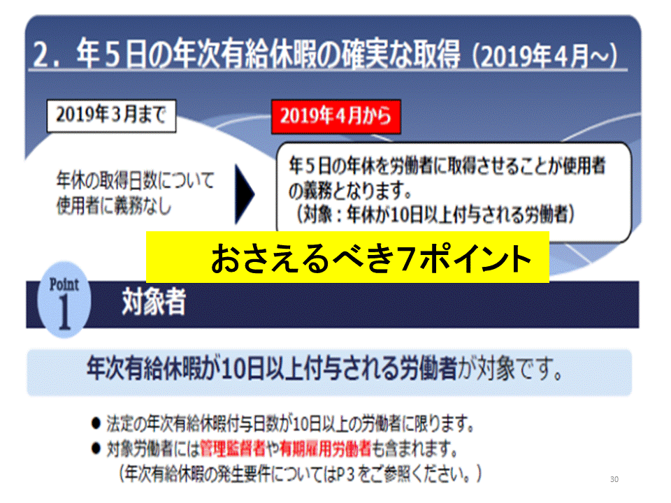 押さえるべき7つのポイントのうち まずポイント1は 年次有給休暇が 10日以上の労働者だけ、うち 5日、きちんと取得させよう