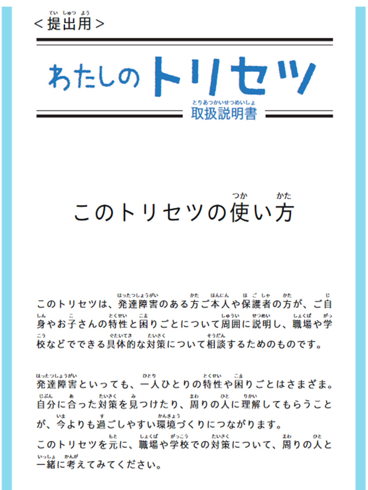 発達障がいのある方ご本人や保護者の方が、ご自身やお子さんの特性と困りごとについて周囲に説明し、職場や学校などでできる具体的な対策について相談するために、NHKが作成したツールである「わたしのとりせつ」を紹介します。